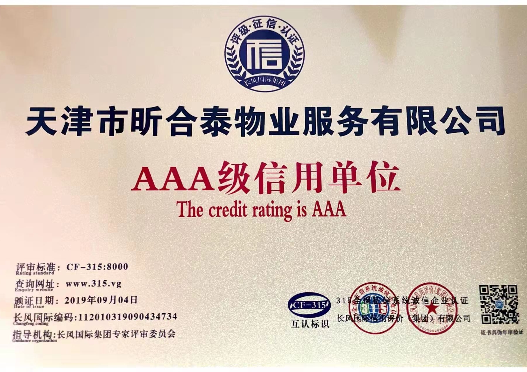 2019年9月,昕合泰物业获评AAA级信用单位荣誉